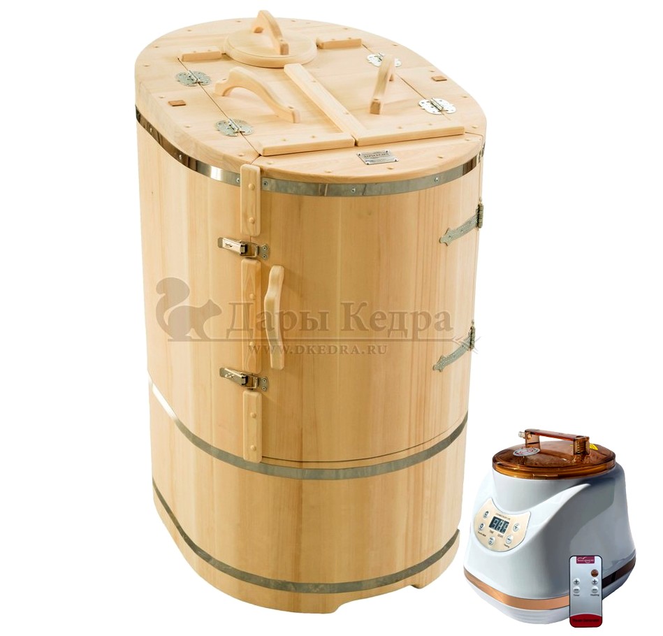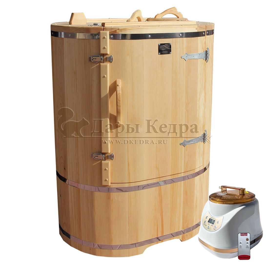 • Готовый комплект «Удобный+»: кедровая бочка с парогенератором + био-защита изнутри и снаружи Готовый комплект - это полностью укомплектованный набор с фитобочкой для процедур парения. Овальная модель более просторна и удобна в использовании. Толщина стенок составляет 25 мм. Бочка оборудована откидными створками, дверцей и отверстием для головы. Верхний скос изделия делает положение головы более комфортным и улучшает обзор. Во время парения человек сидит внутри кедровой бочки, а голова находится снаружи. Благодаря этому исключается возможность перегрева. Подлокотники из кедра, встроенные ручки на створках и двери делают эксплуатацию более удобной. Парение в фитобочке благотворно влияет на организм в целом: повышается иммунитет, выводятся шлаки и токсины, улучшается работа органов тела и состояние кожи.