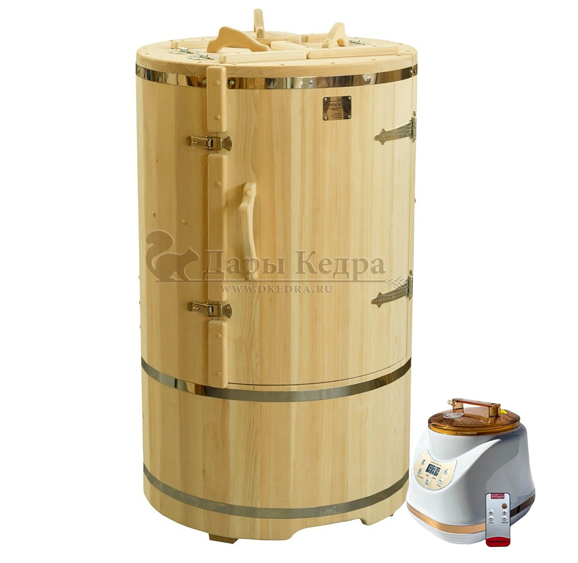 • Готовый комплект «Доступный»: кедровая бочка с парогенератором Готовый комплект - это полностью укомплектованный набор с фитобочкой для процедур парения. Круглая модель наиболее компактна и мобильна. Толщина стенок составляет 25 мм. Фитобочка оборудована откидными створками, дверцей и отверстием для головы. Во время парения человек сидит внутри кедровой бочки, а голова находится снаружи. Благодаря этому исключается возможность перегрева. Подлокотники из кедра, встроенные ручки на створках и двери делают эксплуатацию более удобной. Парение в фитобочке благотворно влияет на организм в целом: повышается иммунитет, выводятся шлаки и токсины, улучшается работа органов тела и состояние кожи.