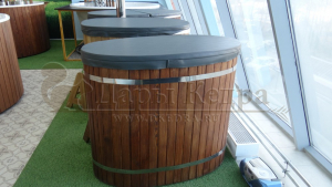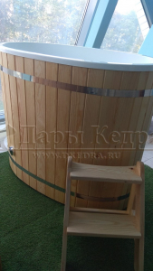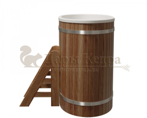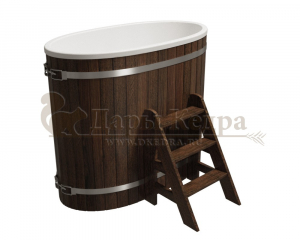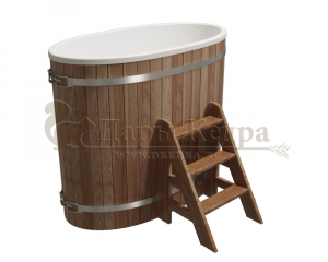 Это купель с внутренней овальной чашей, которая изготовлена из современного прочного и термоустойчивого материала (композита). Форма чаши обеспечивает комфортную посадку внутри изделия. Для удобного использования купель оснащена приставной лестницей. Обручи из нержавеющей стали декорируют купель с композитом и равномерно распределяют нагрузку во время процедур.