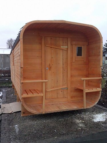 Купили такую баню родителям на дачу, вписалась прекрасно, топить минут 20. Жалеем, что раньше не обратили внимание на вариант мини-бани.